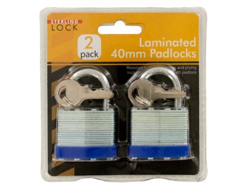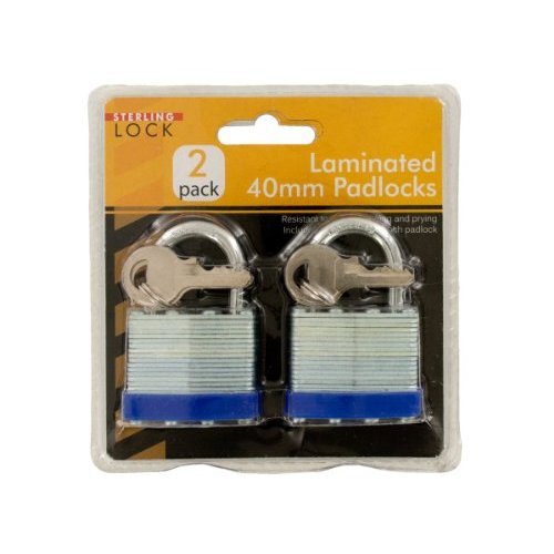 Keep your valuables safe and secure with this set of two Laminated 40mm Padlocks. They are resistant to cutting, sawing and prying. Includes two identical keys for each padlock. Each lock measures approximately 2.5" x 1.5" x 1". Comes packaged in a hanging clam shell. Package measures approximately 5" x 5" x 1.5".