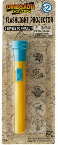 Project a dinosaur image onto the ceiling, wall or other flat surface with this fun Dinosaur Flashlight Projector with five different dinosaur discs to place on the end of the flashlight and project. For ages 3 and up. Requires 2 'AA' batteries (not inclu