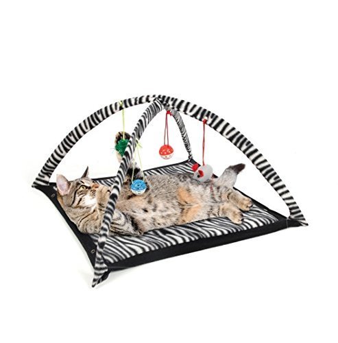 Keep your cat busy for hours with this interactive Cat Play Tent featuring an open arch zebra print tent with 4 hanging toys. Easy to fold for storage in its hanging poly bag. Measures approximately 22" x 23" x 13".