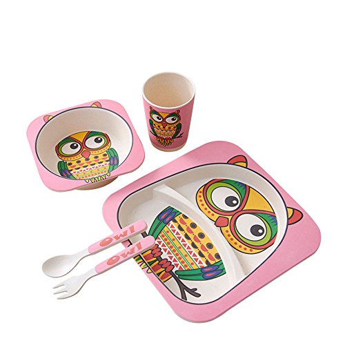 Kuria 竹繊維 ベビー専用食器セット 赤ちゃん 幼児適用 キッズ茶碗 キッズフォーク キッズスプーン キッズプレート 赤ちゃんへのプレゼント 9種類図案提供 (ふくろう)