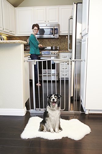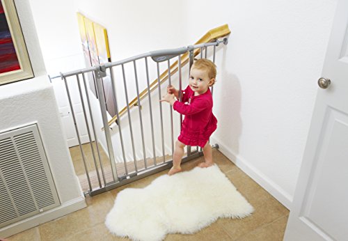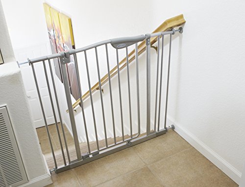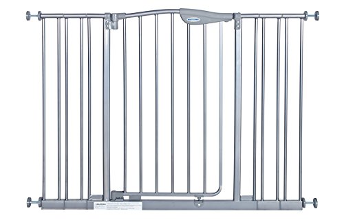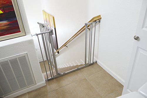 Metal Safety Gate is great for Pets or children from 6 to 24 months and can be used to make stairs safe by using the mounting cups that are included.;One-hand operation for easy use. 100% auto close and comes with color coded indicator line to show open or closed positions.;Open in 2 directions (ways) for easy walk-through. Can be Locked in open position for easy access. Double motion and double locks for more security. Pressure-mounting prevents wall damage or permanent mounting cups are included when using for stairs.;Makes a great room barrier for child or petsPewter color to fit modern decors..;Complies with ASTM F 1004. This SG 35-4 Gate comes with four extensions that increases the opening size by 3.54 or 9 cm for each one and will fit openings from 44.88-47.24 or 114-120 cm. Extra tall Height: 33.6 (85.4 cm)