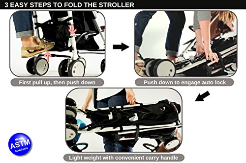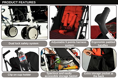 Dual rear wheels as well as swivel dual locking front wheels for extra strength and stability. Spacious and easily accessible storage basket. Multi position footrest with padded bumper bar.;Deluxe tri-colored fabric seat that is easily spot cleaned. Adjustable 5-point harness system. One hand can adjust the seat back either up or down!!;Full sized, 2 sectioned canopy for better sun protection with peek-a-boo window and extra storage pocket at the back.;Dual fold safety system with automatic lock that keeps stroller folded.;Ergonomic padded handles that feel great to mom or dad in any weather.