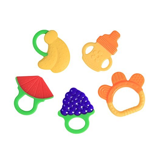 100% SAFE - Made of food guaranteed silicone,FDA approved. BPA, PVC, phthalate free, no worries for baby use.;UNIQUE DESIGN - Lightweight and easy for tiny hands to grasp, hold and play, colourful fruit design keeps baby's interest and stimulates vision development.;BABY MOTOR SKILLS DEVELOPMENT - The raised ridges are moulded to help soothe and massage irritable gums to stimulate and protect the growth of your baby's teeth. The fruit teethers help to keep your baby more comfortable and less irritable throughout the teething process whilst also developing the essential touch and feel senses that are vital for baby spatial development.;IDEAl GIFTS - 5 cute teethers beautifully encased in an environmentally friendly bag. This offers amazing value and is perfect for your baby or as a gift.;FULL REFUND- We are so confident that you will love LAIMALA teether set that we are happy to offer you a full refund if you are not 100% satisfied. A totally risk-free buy - order now.
