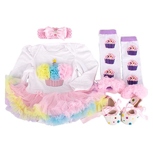 ベビー ワンピース風 ロンパース 長袖 0-3M 3-6M 6-12M 50 60 70 80 おそろいの ヘアバンド ブーティ 付き 女児 781 (6-12M, ケーキ・虹色)