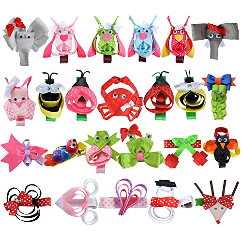 このカワイイヘアリボン24個セットには、小さいネズミ、芋虫、ハート型、トナカイ、雪だるま、ワニ、小さなハチ2匹、カエル、魚、七面鳥、カメ、カニ、てんとう虫2匹、ゾウ2頭、鳥、フクロウ4羽などのが含まれています。グログランリボンを使いハンドメイドし、鋭い歯を使わず、髪に差し込みやすく、また絡まらない、半分をリボンでくるんだ頑丈なワニ口クリップに付けました。このベビー用ヘアリボンは、時と場合をほとんど選ばずお使いいただけます。