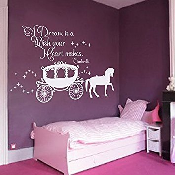 Wall Decal Decor Cinderella Quote - A dream is a wish your heart makes Wall Decal with Princess Carriage for Girls Nursery Baby Gift Kids Decal(White 22h x34w)