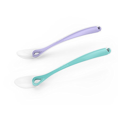 Kidsmile 2Pcs Gentle Baby Feeding Spoons Set with Extended Stem BPA Free Food-Grade Soft Silicone for Teething Infant Purple+Green