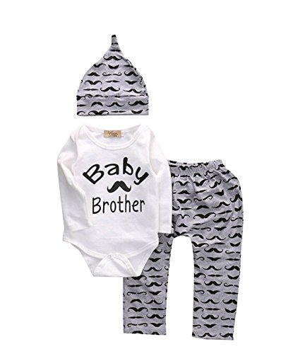 長袖ロンパース+ひげ柄ロングパンツ+帽子 コットン 上下三点セット (12-18月, ホワイト+グレー)