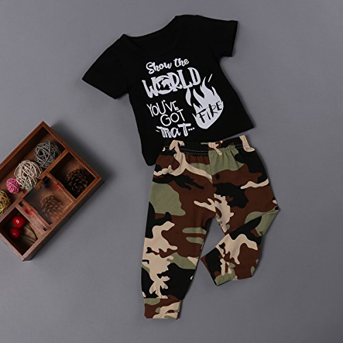 幼児 男 レタープリント 半袖Tシャツ &ウェストゴム 迷彩ズボン 上下 2点セット ベビー服 普段着 (100, ブラック+迷彩)