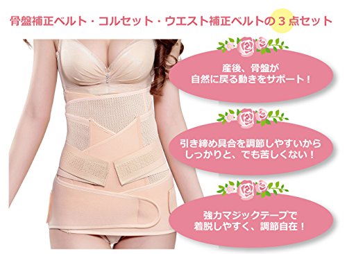 - 出産後すぐに使用いただける骨盤補正ベルトから数日後からの使用がおススメのコルセット・ウエスト補正ベルトの3点セット。