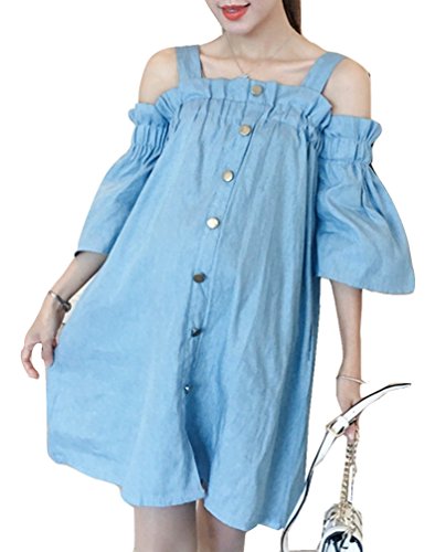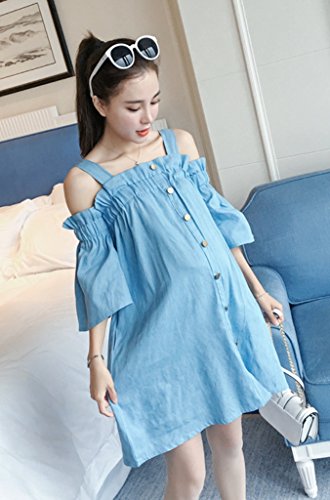 レディース 夏物 ワンピース マタニティ 1色のみ デニム 無地 オフショルダー かわいい ゆったり オリジナルアクセサリー付属 PLA000544 (ブルー)