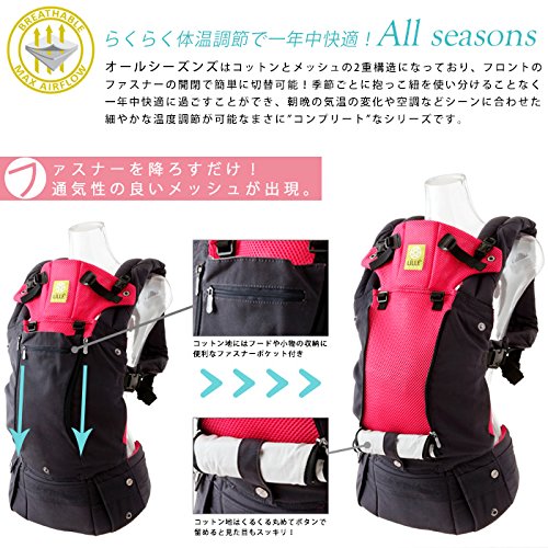日本初登場!赤ちゃんの成長と月齢に合わせて6通りの抱っこができる、 新型ベビーキャリア【リルベビー コンプリート】! 今までのベビーキャリアにはなかった2種類のシートサイズ調整により、インサートなどの追加購入無しで新生児からトドラーまで個々の成長段階に合わせた安全で最適な抱き方が可能。特に前向き抱っこはママやパパと同じ景色を見ながら過ごせるので、赤ちゃんも大喜び! 首が座らない赤ちゃんの”首カックン”を防ぐ「ネックサポート」や、パパやママの腰への負担を軽減する「ランバーサポート(腰パッド)」が標準装備されているので、届いたその日から快適な抱っこができます。 【オールシーズンズ(チャコールシルバー×スター)】は、パパも一緒に使えるデザイン。 コットン地についたファスナーを降ろすだけで通気性のよいメッシュが出現する、発売以来大人気の「オールシーズンズ」で通年快適な抱っこライフを過ごせます。