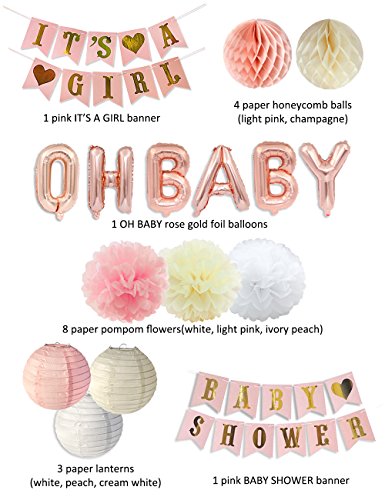- ベビーシャワーの装飾キット: 8ペーパーポンポンフラワーホワイト、ライトピンク、アイボリーピーチクリームが搭載されているため、3提灯ホワイト、ピーチ、ホワイトが搭載されているため、4紙ハニカムボールライトピンク、シャンパン、見事な1ピンクBaby Showerバナー、1ピンクIT 's A Girlバナー、1ベビーローズゴールドホイルバルーンに適用されます。合計18赤ちゃんの飾り物の女の子。