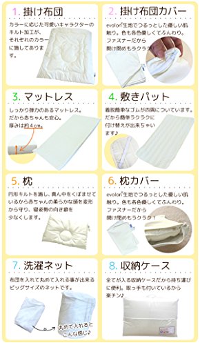【4】マットレス(約)70×120cm 表地:ポリエステル70%、綿20% 中綿:ウレタンフォーム、ポリエステル(固わた) - 【5】掛け布団カバー(約)100×130cm 表地:ポリエステル70%、ナイロン30%(高性能ミクロフィラメント) 【6】枕カバー(約)30×40cm 表地:ポリエステル70%、ナイロン30%(高性能ミクロフィラメント