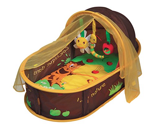 Child's bed perfect for spending time in the garden, going on holiday or a weekend get-away with friends, and with your baby;Wake-up activities with audible, tactile, and visual stimuli;Detachable padded mattress;Articulated anti-UV hood with mosquito netting;Easy to clean with a damp cloth