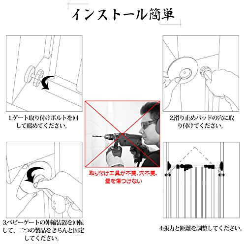 - 【取り付け】穴あけ、取り付け工具はご不要です。直接ゲイトの取付ボルトを滑り止めパッドの穴にはめ込みだけで完成!壁にも傷つかない!