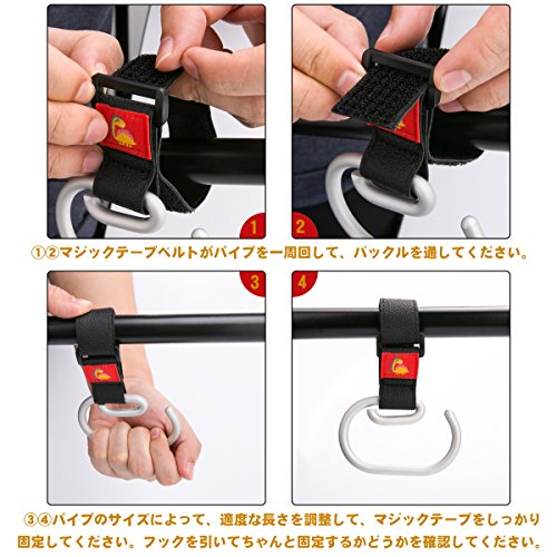- 【注意】転倒の危険がありますので、お子様をベビーカーから降ろす前に必ず掛けたモノをフックから取り外してください。また、重すぎるモノは掛けないでください.