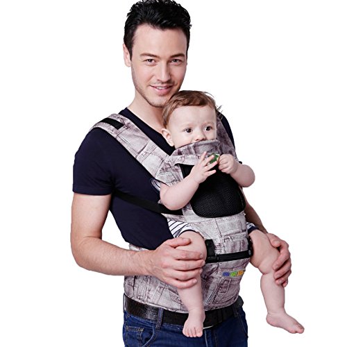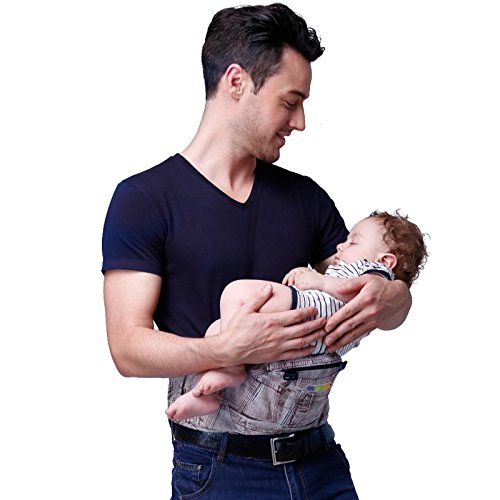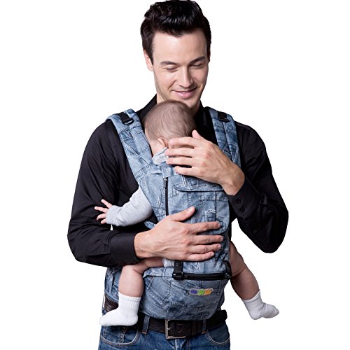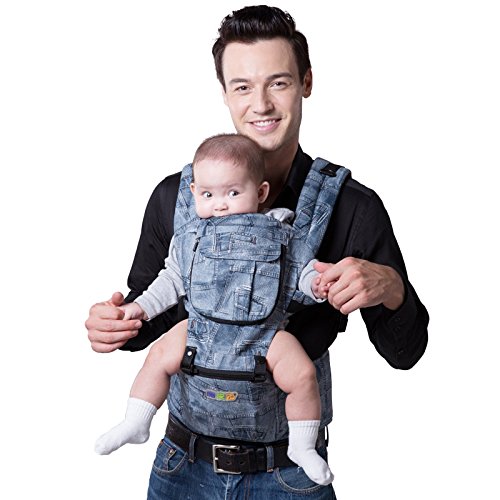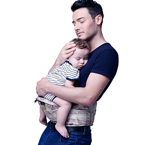 ベビー抱っこ紐デニムプリント柄 赤ちゃんの姿勢とママの負担を軽減させるために作られた新しい抱っこひも もっちり肩滑べ止め臀部シート付き 高い通気性 柔らか 調節できる 大いポケット付き 多機能 (ブルー)