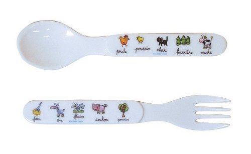 - ウシやニワトリなど牧場のかわいい動物達のイラストのメラミン製フォーク&スプーンのセットです。