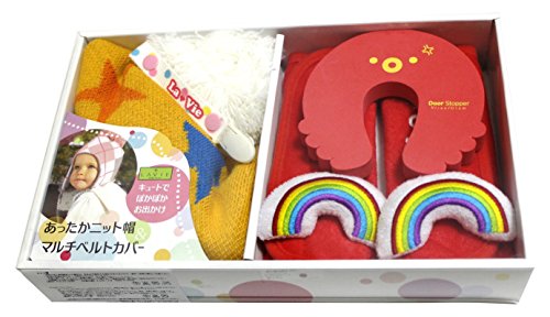 LaVie ギフトBOX 4点セット ベルトカバーレインボー&ニット帽イエロースター ドアストッパータコ おしゃぶりホルダーホワイトドット b137