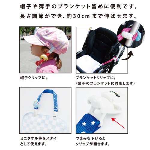 ●商品説明:帽子を落とす心配がいらないクリップ(ベビー用)です。帽子を落としたり、置き忘れないからとっても便利。両端クリップ留めなので、どこにでも手軽に取り付けられます。長さ調節ができ、約30cmまで伸ばせます。クリップにタオルなどを留めてスタイにも使えます。この商品はホルマリンの安全基準を満たしています。