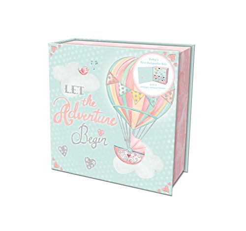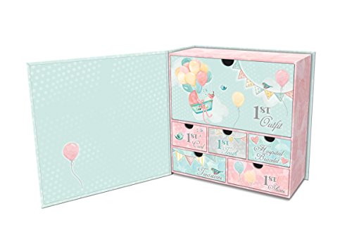 Lady Jayne Balloon Adventure memory box with embellished cover and magnetic closure;Has 6 drawers to hold baby's first mementoes, from hospital bracelet to first tooth;Measures 10 w x 10 h x 4.5 d;Cover reads Let the Adventure Begin!;Drawers for first shoes, first curl, first outfit, and other treasures