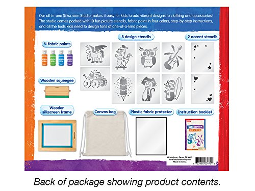 このオールインワンのシルクスクリーンStudioは、ユーザーが追加することを子供生き生きとしたデザインで、服やアクセサリーになります画像とはStudioには、木製のシルクスクリーンフレームとスキージ付き、10ステンシルと4色の生地にペイントデザイントンの一点モノのピースができることになります。でも、Studioは、イラストデザイン本します。手順の詳細、やキャンバスバッグ子に装飾フレームの寸法は9 " X 11」を参照してください。