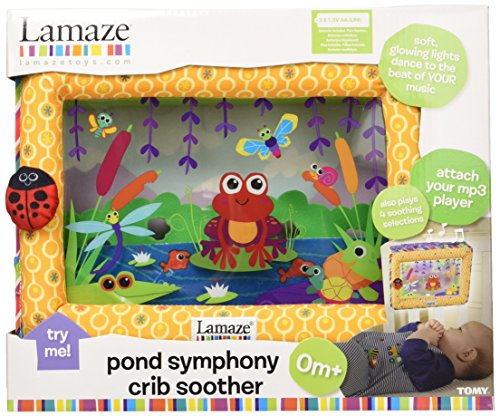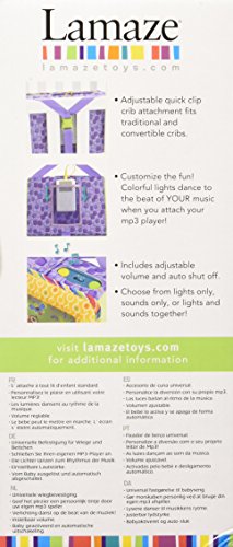With lovable animal characters and bright colors, this soft musical soother welcomes baby? touch and encourages tactile exploration. When the soother is activated, soft, colorful lights slowly turn on and off, calming baby and keeping him engaged. The soother will also lull baby to sleep with three classical melodies or soothing nature sounds. Settings on the soother allow Mom to choose from lights only, sounds only, or lights and sounds together. For an even more customized experience, Mom can connect her own mp3 player and the lights will dance to the beat of the music. It also includes adjustable volume, an auto-shut off button and an adjustable crib clip that fits all cribs.