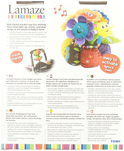 Great for building hand-eye coordination and strength, the Soft Chime Garden encourages baby to reach, tug, and bat. Simply touch soft flowers to make them play a note and make the lights come on ? an instant reward even for the smallest hands. Featuring soft textures, ribbons, and friendly smiling faces, it provides baby with multi-sensory fun and encourages two-handed play. Choose from three modes of music to awaken baby's auditory awareness. Complete with an attachment strap, the Soft Chime Garden easily attaches to a stroller or carrier bar for on-the-go fun. Suitable for children aged 6 months and over.