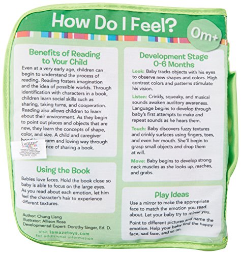 The Lamaze How Do I Feel? Soft Book is fabric book designed to encourage baby's imagination. Washable fabrics, durable pages, bright contrasting colors, and specially designed developmental features make it fun for babies and toddlers to discover, learn, and read. The book features a series of emotions for baby to learn by association. Even at a very young age, children can begin to understand the process of reading. Reading fosters imagination and the idea of possible worlds. Through identification with characters in a book, children learn social skills such as sharing, taking turns, and cooperation. Reading also allows children to learn about their environment. As they begin to point out places and objects that are new, they learn the concepts of shape, colour, and size. A child and caregiver bond in a warm and loving way through the experience of sharing a book.