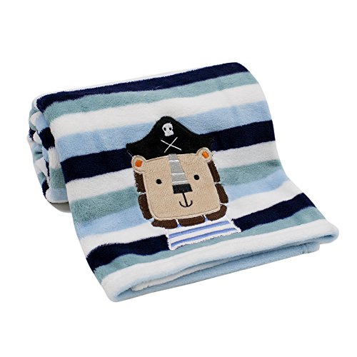 The striped 30x 40 coral fleece blanket is made of 100% soft polyester coral fleece and features an applique of the pirate captain;Care instructions: machine wash cold with like colors in gentle cycle, do not bleach tumble dry low
