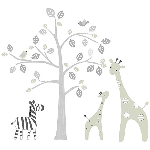 A lovely oversized tree in gray and sand decorate the nursery walls along with our stylized giraffes and zebra.;The easy-on, easy-off wall appliques come in a set of 4 sheets.;Peel & stick, wipe clean