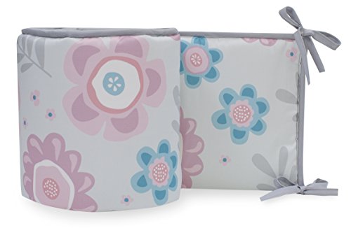 Floral blooms in pink, fuchsia, aqua, and gray decorate our 4 piece perfect fit crib bumper; There are 24 sets of wide bumper ties which need to be securely tied to the top and bottom of the crib for safe sleep;; Care instructions: machine wash cold with like colors in gentle cycle, do not bleach, tumble dry low, and iron on lowest setting as needed; Fabric is 100% cotton sateen, polyester fiberfill, measures 10 high x 154 long