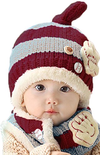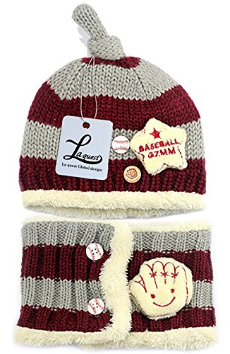(ラクエスト) Laquest 裏ボア ボーダー ニット帽 & マフラー セット ベビー キッズ ネックウォーマー (グレー×ワイン)