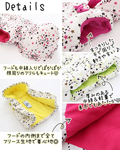 - ふんわり厚みのある中綿入り。フロントのリボンとフードのフリルも可愛い❤内側はポップなカラーのフリース素材なので、寒い冬でも快適に過ごせます。