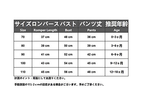 - 素材:コットン(ロンパース)&ポリエステル(パンツ)。柔らかい素材、ベビー肌に優しく、着心地も快適。