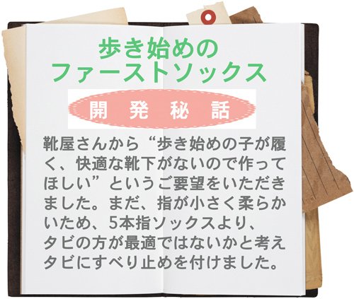 子供専用の編み機で編んでいますので、小さい足にもフィットします。 そして、特殊な加工をしていますので、長持ちします。