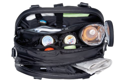 Ultra-chic and feminine with two main compartments;Water-repellent wet pocket, changing mat, zip pouch, for ease and simplicity;Convenient to place on stroller thanks to included stroller hooks;Additional, adjustable shoulder strap;Insulated, removable bottle holder and removable compartment for baby jars;Detachable key fob, stroller hooks with clips, removable section for baby food containers (easy clean up);Removable insulated bottle holder, changing pad, tons of pockets inside and out;Removable zipper pouch for credit cards and cash, cell phone pockets;Pen holders and zippered wet pocket to separate clean from dirty;Easily wipes clean