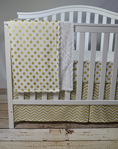 15 crib skirt in gold metallic chevron;Standard sized crib sheet in gold metallic dot fabric;Blanket has metallic dot fabric on the front and super soft minky swirl fabric on the back;Blanket is 35x42