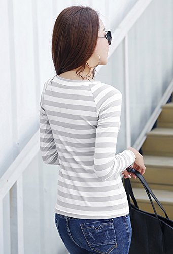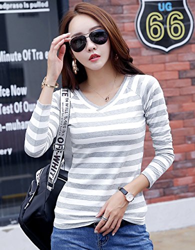 (ル・セリジエ) レディース 長袖 カットソー ボーダー ロング Tシャツ Vネック きれいめ ライン カジュアル (グレーL)