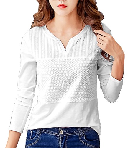 (ル・セリジエ) レディース 長袖 カットソー 花 柄 きれいめ ロング Tシャツ Vネック ライン オフィス カジュアル (ホワイトXL)