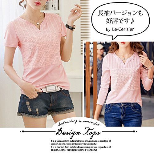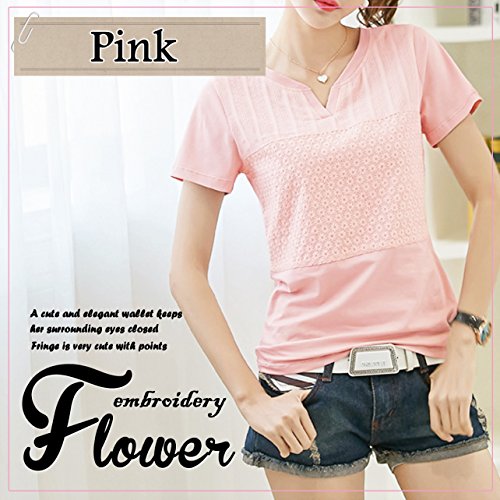 [ル・セリジエ] 半袖 カットソー レディース 花 柄 きれいめ シンプル Tシャツ Vネック ライン オフィス カジュアル (ピンクM)
