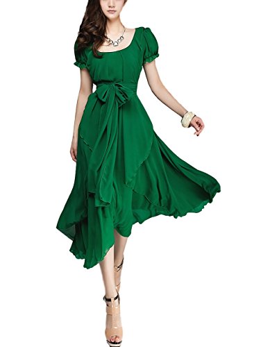 (ル・セリジエ) レディース シフォン ロング ドレス ワンピース マキシ 丈 ラウンドネック フォーマル (緑XL)