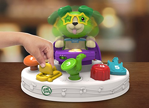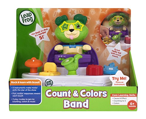 Rock and learn with piano-pup Scout!;Play 5 instruments with Scout and get motor skills jamming, Explore 3 learning modes: counting, colours and music;Helps teach cause and effect, counting to 5 and colours. Promotes auditory development and music appreciation for kids;Promotes auditory development and music appreciation for kids;Contents: LeapFrog Scout's Count and Colours Band