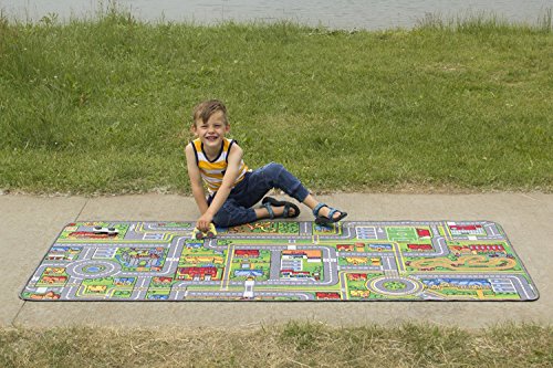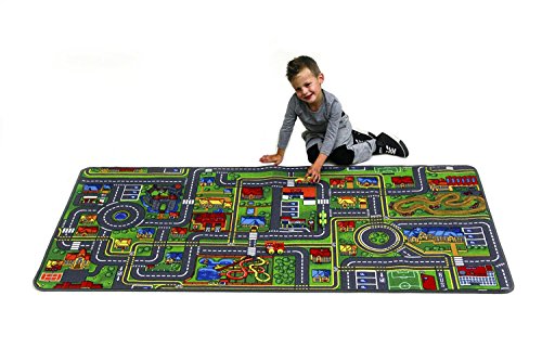 Superb quality, beautiful road design and colorful play carpet. Able to withstand rugged wear. Exclusive durable all around serging. Made from 100% polypropylene. Durable latex gel skid backing. Meet all safety