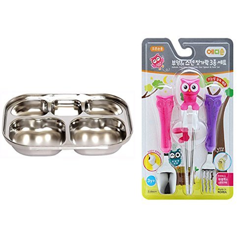 Edison Kids Spoon Fork Set (Spoon Fork Chopsticks Set( Owl Set of 3 Pink) + Stainless Steel Tray) [並行輸入品]