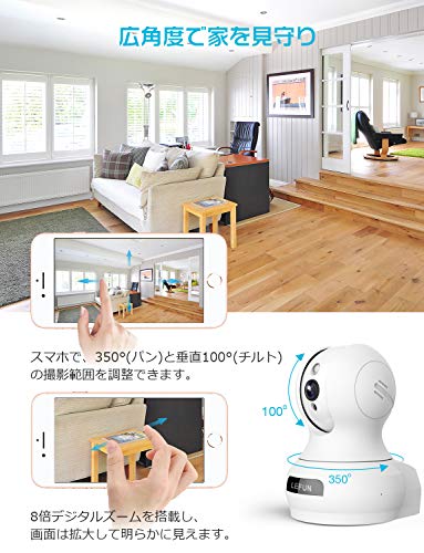 - 【広い視角&暗視機能】水平(パン)350° 垂直(チルト)100°の広い視角で、アプリに簡単に調整でき、全方位から家を見守ります。また赤外線LEDライトより、夜にも10メートルの暗視範囲を達します。