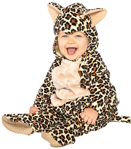 - Includes hooded, leopard-print, plush bodysuit with snap closure for easy diaper change access and non-skid soles.