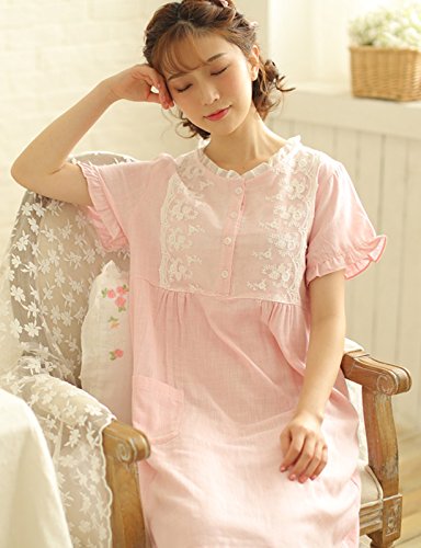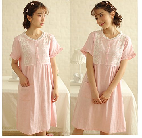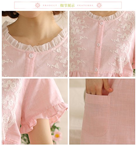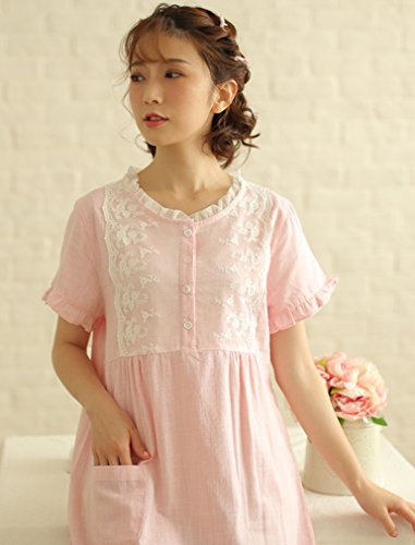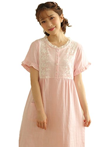 (レモンツリーセブン)Lemon tree7 レディース 綿100% 半袖 ワンピース お洒落 夏 ロング フレア 無地 可愛い レース プリーツ フリル ルームワンピース ゆったり ネグリジェ ブラウス ピンク M