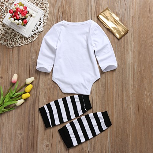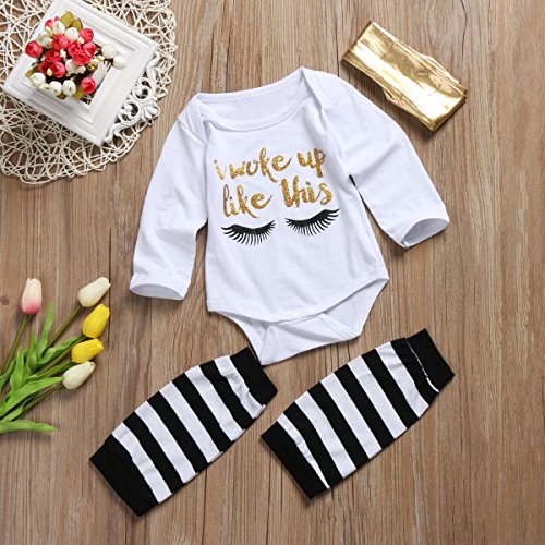 ベビー服 綿100% スパンコール 英字 まつげ ロンパース ストライプ レギンス ゴールド ヘッドバンド ボディースーツ 秋冬 (80, ホワイト)